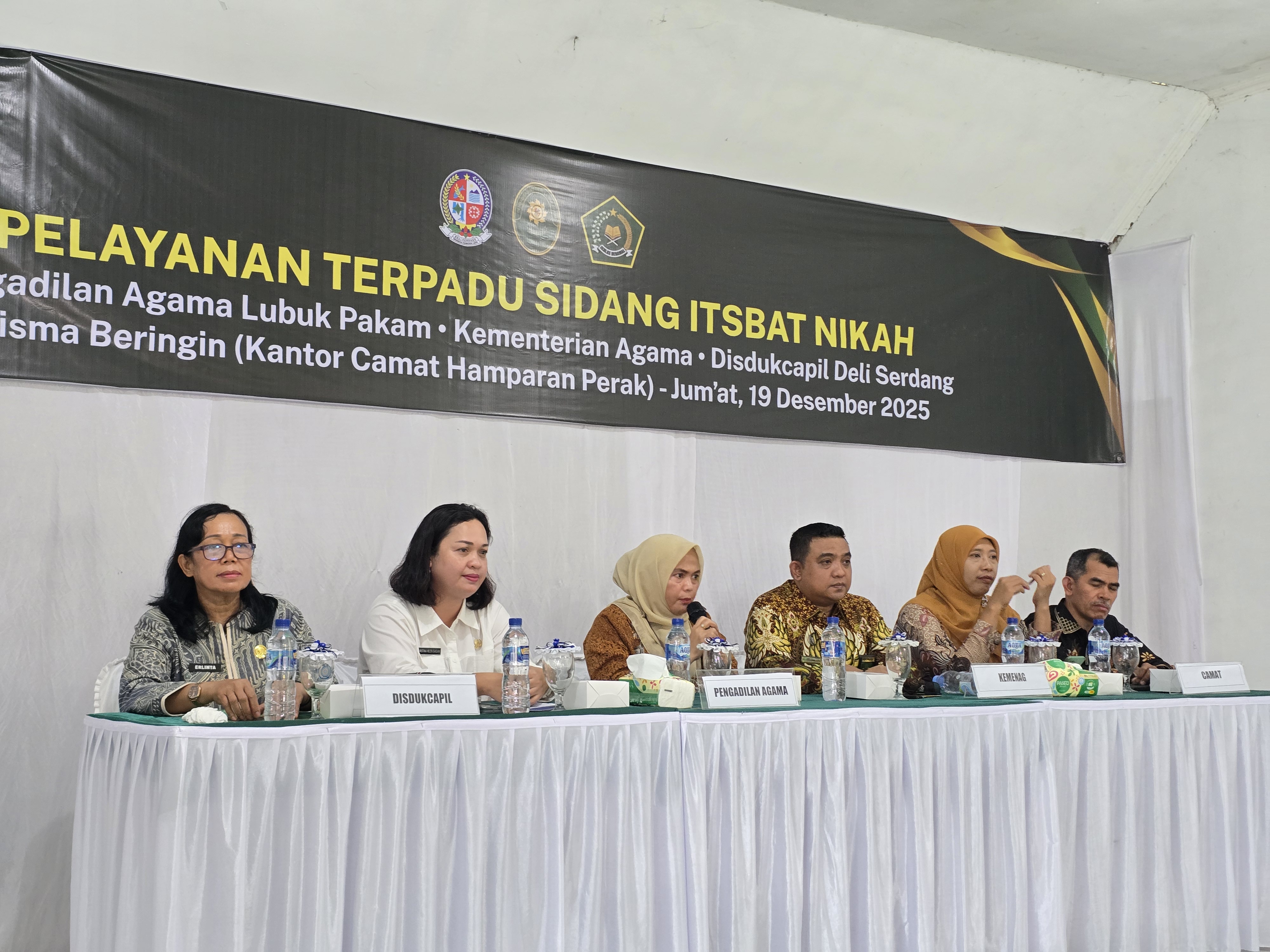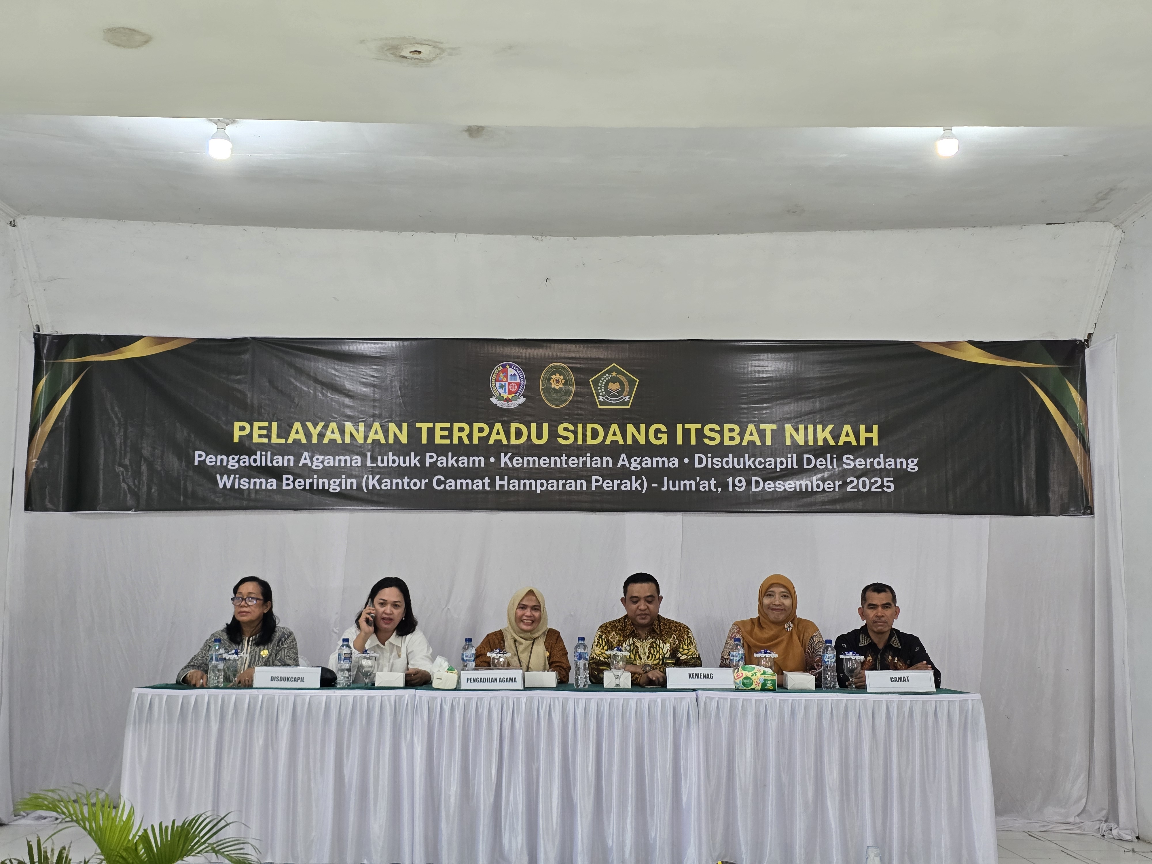 Hamparan Perak, (19 Desember 2025). Pengadilan Agama (PA) Lubuk Pakam kembali melaksanakan Pelayanan Terpadu Sidang Itsbat Nikah sebagai bentuk sinergi lintas instansi dalam memberikan pelayanan hukum dan administrasi kependudukan kepada masyarakat. Kegiatan ini merupakan kerja sama antara PA Lubuk Pakam, Kementerian Agama Kabupaten Deli Serdang, dan Dinas Kependudukan dan Pencatatan Sipil (Dukcapil) Kabupaten Deli Serdang.