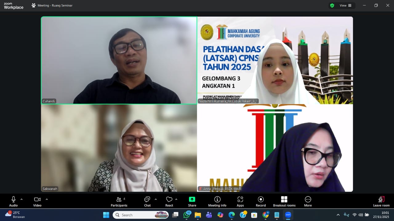 Lubuk Pakam (27 November 2025). Pengadilan Agama (PA) Lubuk Pakam melaksanakan Seminar Aktualisasi Pelatihan Dasar (Latsar) CPNS pada Kamis, 27 November 2025 secara daring. Kegiatan ini merupakan bagian dari rangkaian penilaian aktualisasi bagi Calon Pegawai Negeri Sipil yang tengah mengikuti Latsar guna memperkuat kompetensi, profesionalisme, serta pemahaman nilai-nilai dasar ASN.