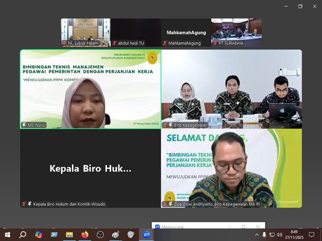 Lubuk Pakam (27 November 2025). Pegawai Pemerintah dengan Perjanjian Kerja (PPPK) pada Pengadilan Agama (PA) Lubuk Pakam mengikuti kegiatan Bimbingan Teknis (Bimtek) Manajemen PPPK yang diselenggarakan oleh Badan Urusan Administrasi (BUA) Mahkamah Agung Republik Indonesia. Kegiatan ini dilaksanakan sebagai tindak lanjut dari Surat Undangan Plh. Kepala Biro Kepegawaian Nomor 4223/BUA.2/UND.KP/XI/2025 tanggal 26 November 2025 tentang Undangan Bimbingan Teknis Manajemen PPPK.
