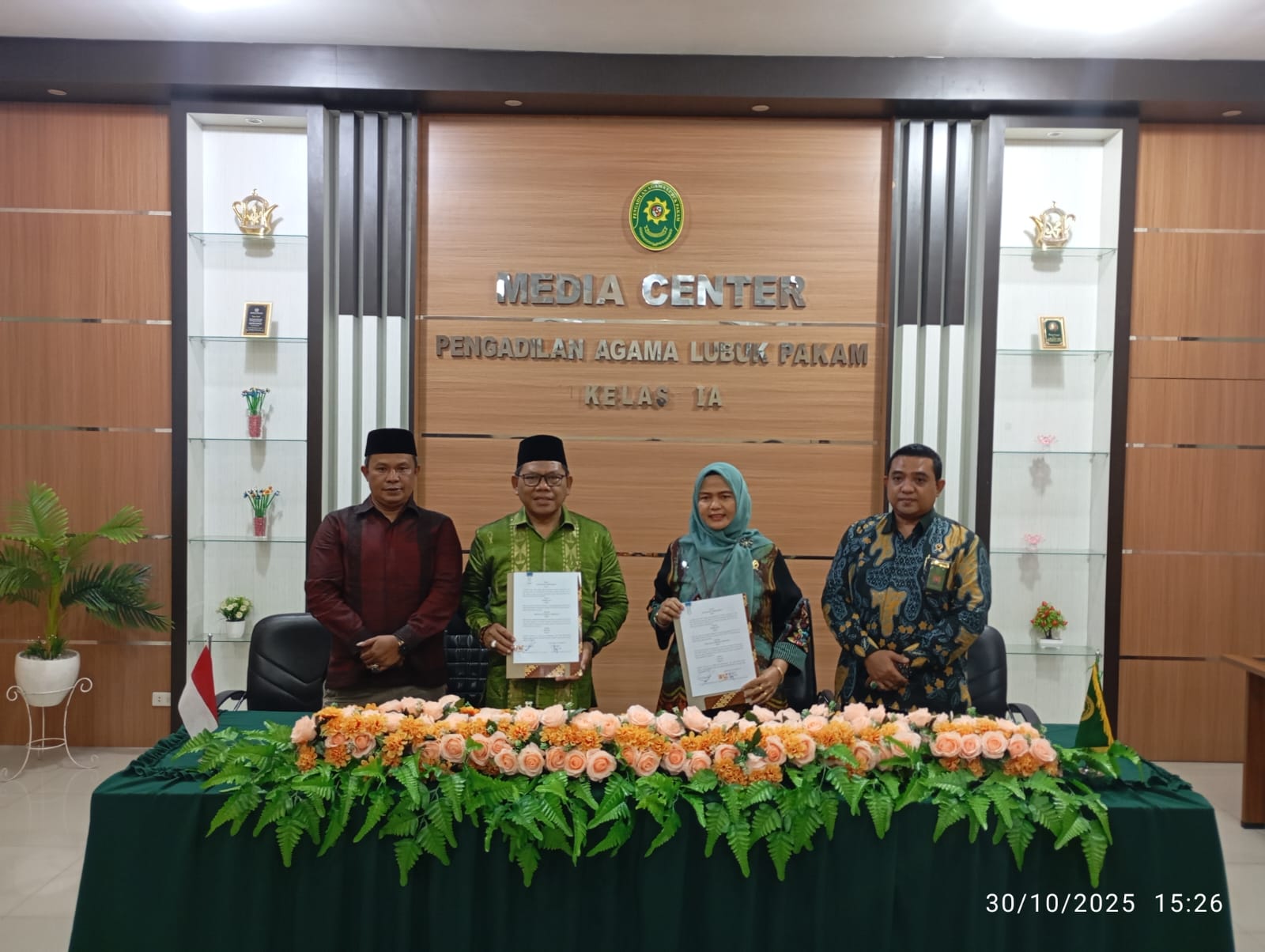 Penandatanganan dilakukan langsung oleh Ketua Pengadilan Agama Lubuk Pakam, Dr. Hj. Sakwanah, S.Ag., S.H., M.H., bersama Kepala Kementerian Agama Kabupaten Deli Serdang, Dr. H. Saripuddin Daulay, S.Ag., M.Pd., bertempat di Ruang Media Center PA Lubuk Pakam.