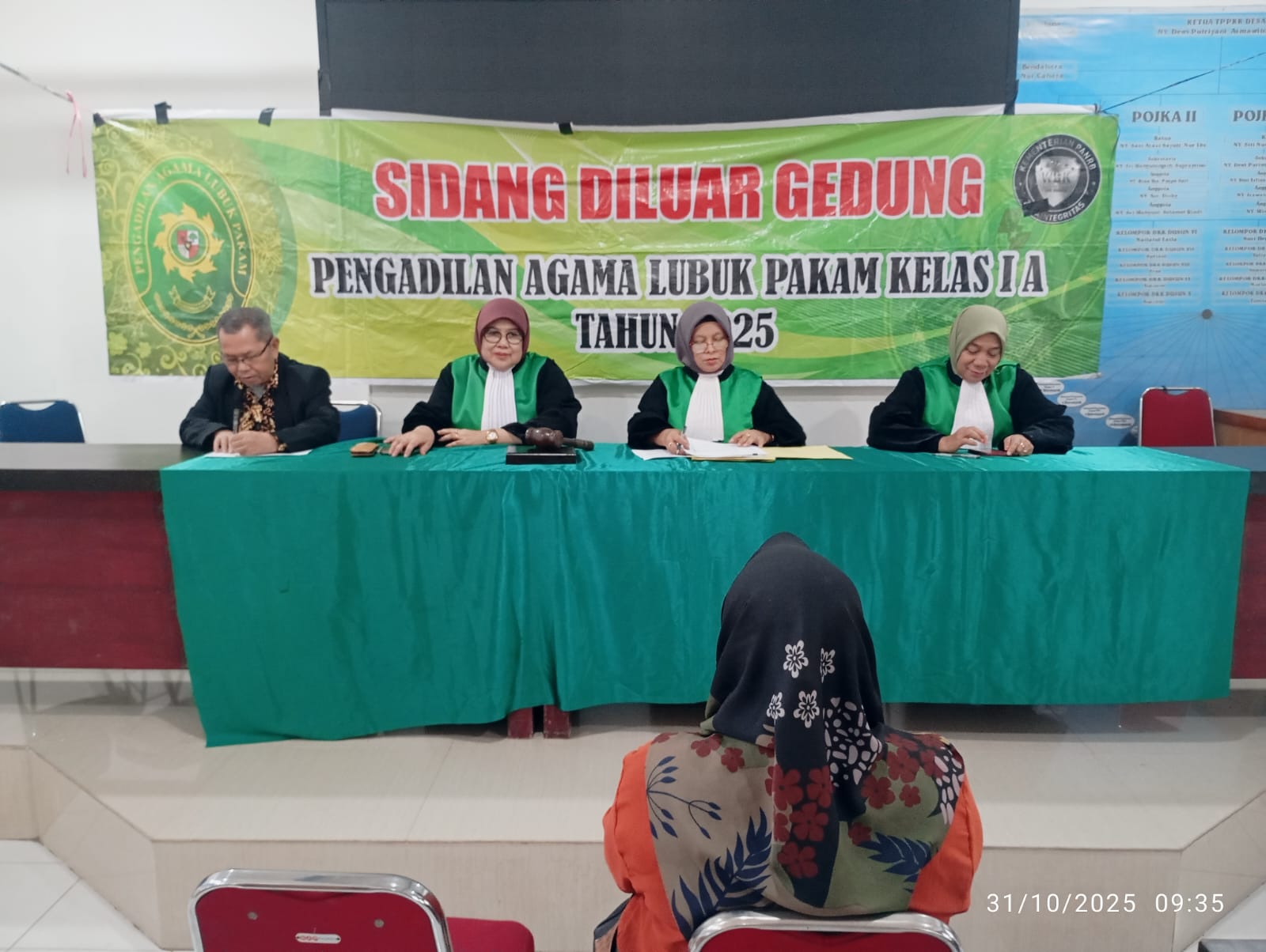 Lubuk Pakam (31 Oktober 2025). Pengadilan Agama (PA) Lubuk Pakam kembali melaksanakan kegiatan sidang di luar gedung sebagai bagian dari upaya meningkatkan akses masyarakat terhadap keadilan. Kegiatan ini menjadi pelaksanaan terakhir sidang di luar gedung untuk tahun 2025 dan digelar di Kantor Camat Sunggal serta Kantor Desa Saentis, Kabupaten Deli Serdang.