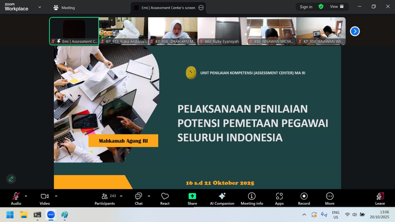 Lubuk Pakam (20 Oktober 2025). Rizka Ardiana Lubis, S.E., M.A. (Klerek - Pengolah Data dan Informasi) mengikuti kegiatan Penilaian Potensi Pegawai Negeri Sipil di Lingkungan Mahkamah Agung RI dan Badan Peradilan di Bawahnya. Kegiatan ini merupakan Program Kerja Unit Penilaian Kompetensi (Assessment Center) Mahkamah Agung RI Tahun Anggaran 2025 bagi 1269 (seribu dua ratus enam puluh sembilan) Pegawai. Profile Assessment dilaksanakan pada tanggal 16 s.d. 21 Oktober 2025 yang dilakukan secara daring (online) pada Satuan Kerja masing-masing.