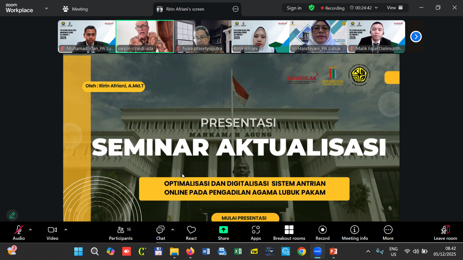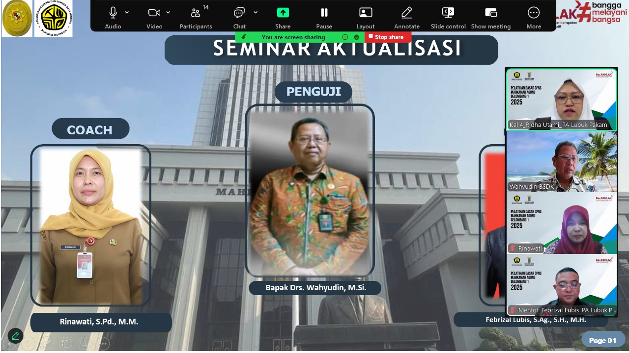 Lubuk Pakam (5 Desember 2025). Pengadilan Agama Lubuk Pakam kembali menunjukkan komitmennya dalam mendukung pengembangan kompetensi Aparatur Sipil Negara (ASN) melalui pelaksanaan Seminar Laporan Aktualisasi Calon Pegawai Negeri Sipil (CPNS) Golongan II, yang digelar secara daring.