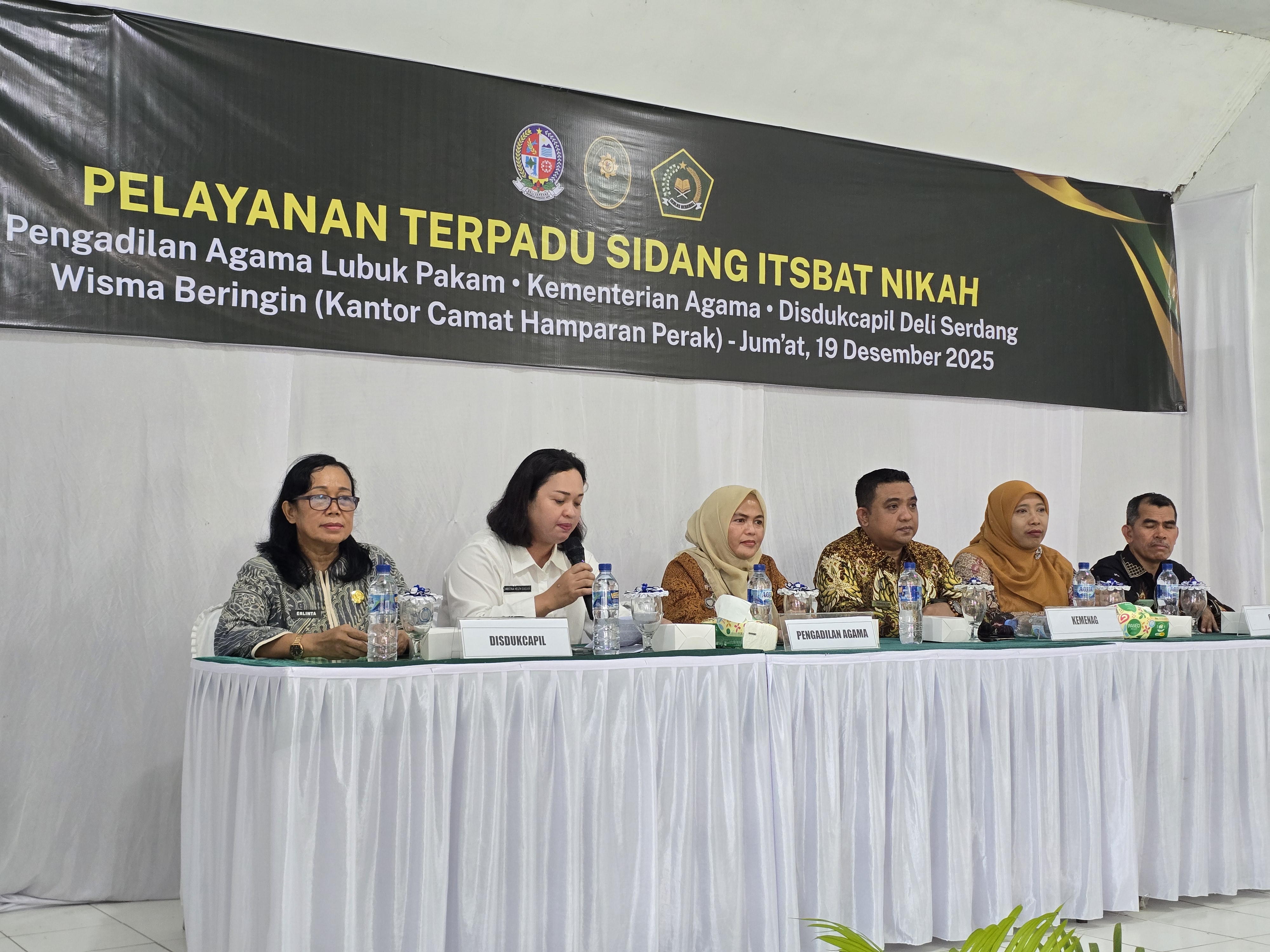 Hamparan Perak, (19 Desember 2025). Pengadilan Agama (PA) Lubuk Pakam kembali melaksanakan Pelayanan Terpadu Sidang Itsbat Nikah sebagai bentuk sinergi lintas instansi dalam memberikan pelayanan hukum dan administrasi kependudukan kepada masyarakat. Kegiatan ini merupakan kerja sama antara PA Lubuk Pakam, Kementerian Agama Kabupaten Deli Serdang, dan Dinas Kependudukan dan Pencatatan Sipil (Dukcapil) Kabupaten Deli Serdang.