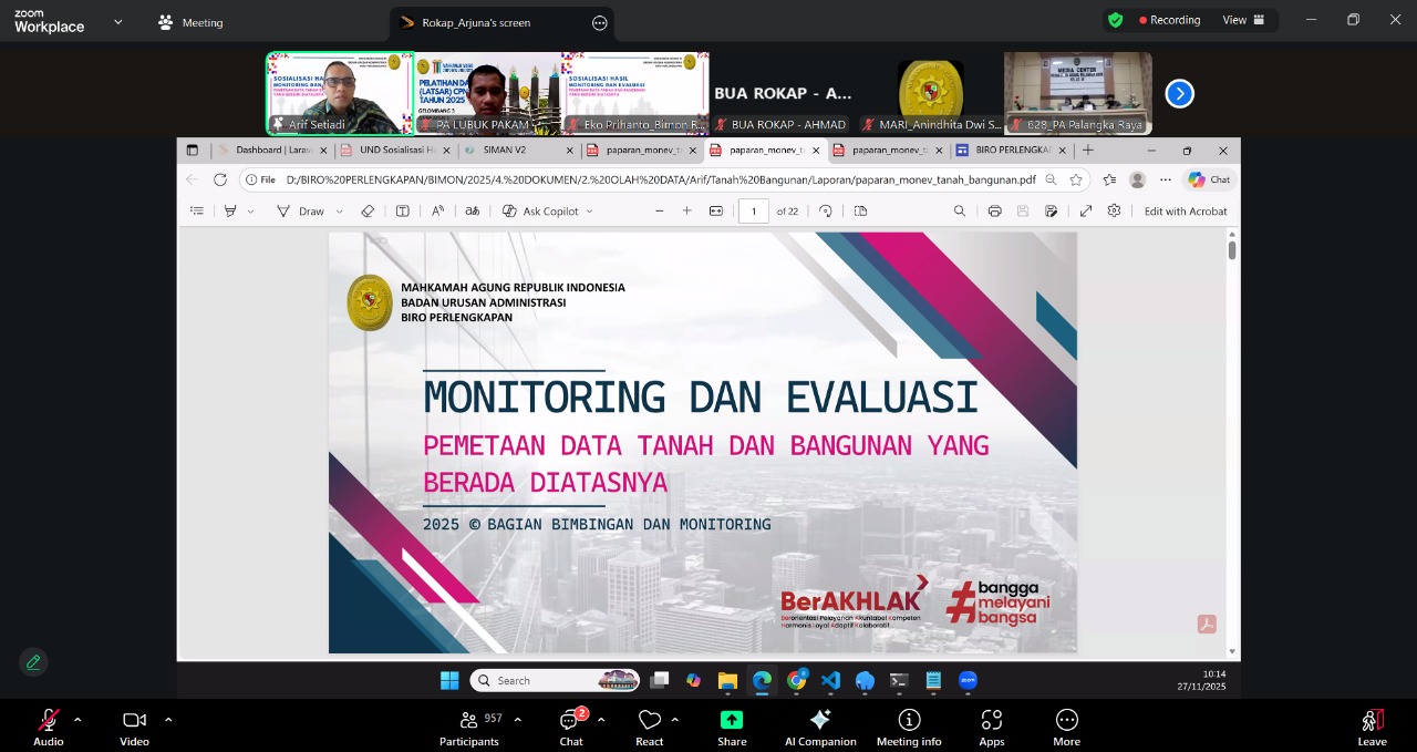 Lubuk Pakam (27 November 2025). PA Lubuk Pakam mengikuti kegiatan Sosialisasi Hasil Monitoring dan Evaluasi (MONEV) Pemetaan Data Tanah dan Bangunan yang berada di atasnya pada satuan kerja di lingkungan Mahkamah Agung RI secara daring. Kegiatan ini bertujuan menyampaikan hasil inventarisasi, validasi, dan pemetaan aset tanah dan bangunan milik negara agar pengelolaan aset semakin tertib, transparan, dan akuntabel.