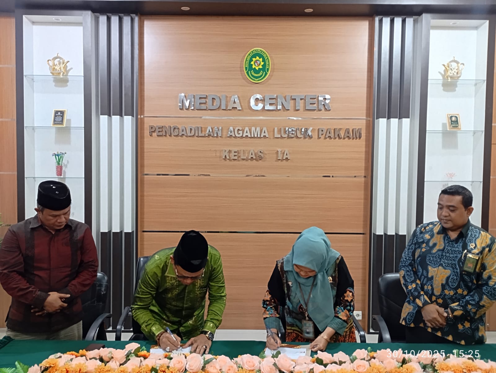 Penandatanganan dilakukan langsung oleh Ketua Pengadilan Agama Lubuk Pakam, Dr. Hj. Sakwanah, S.Ag., S.H., M.H., bersama Kepala Kementerian Agama Kabupaten Deli Serdang, Dr. H. Saripuddin Daulay, S.Ag., M.Pd., bertempat di Ruang Media Center PA Lubuk Pakam.
