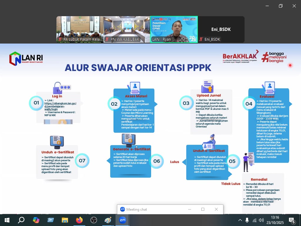 Lubuk Pakam (23 Oktober 2025). Pegawai Pemerintah dengan Perjanjian Kerja (PPPK) pada Pengadilan Agama Lubuk Pakam mengikuti kegiatan Orientasi Pegawai Pemerintah dengan Perjanjian Kerja (PPPK) Tahun 2025 secara daring pada Kamis (23/10/2025). Kegiatan ini berlangsung di Ruang Media Center Pengadilan Agama Lubuk Pakam.